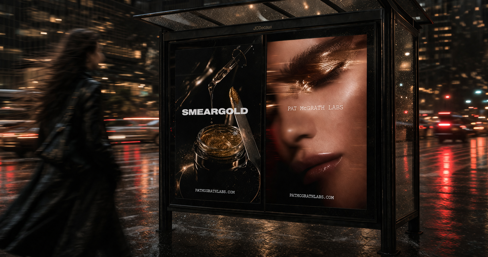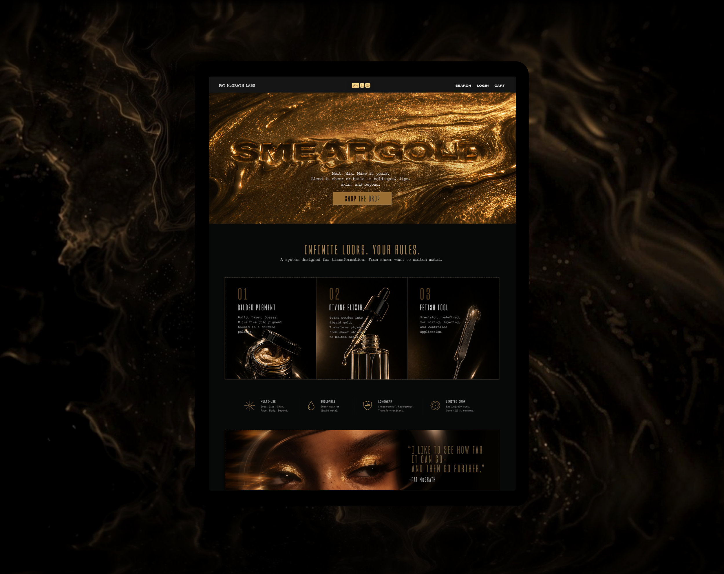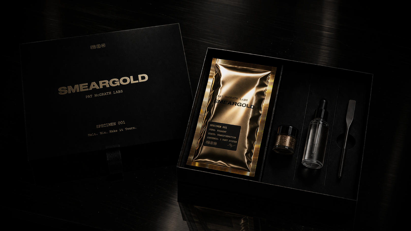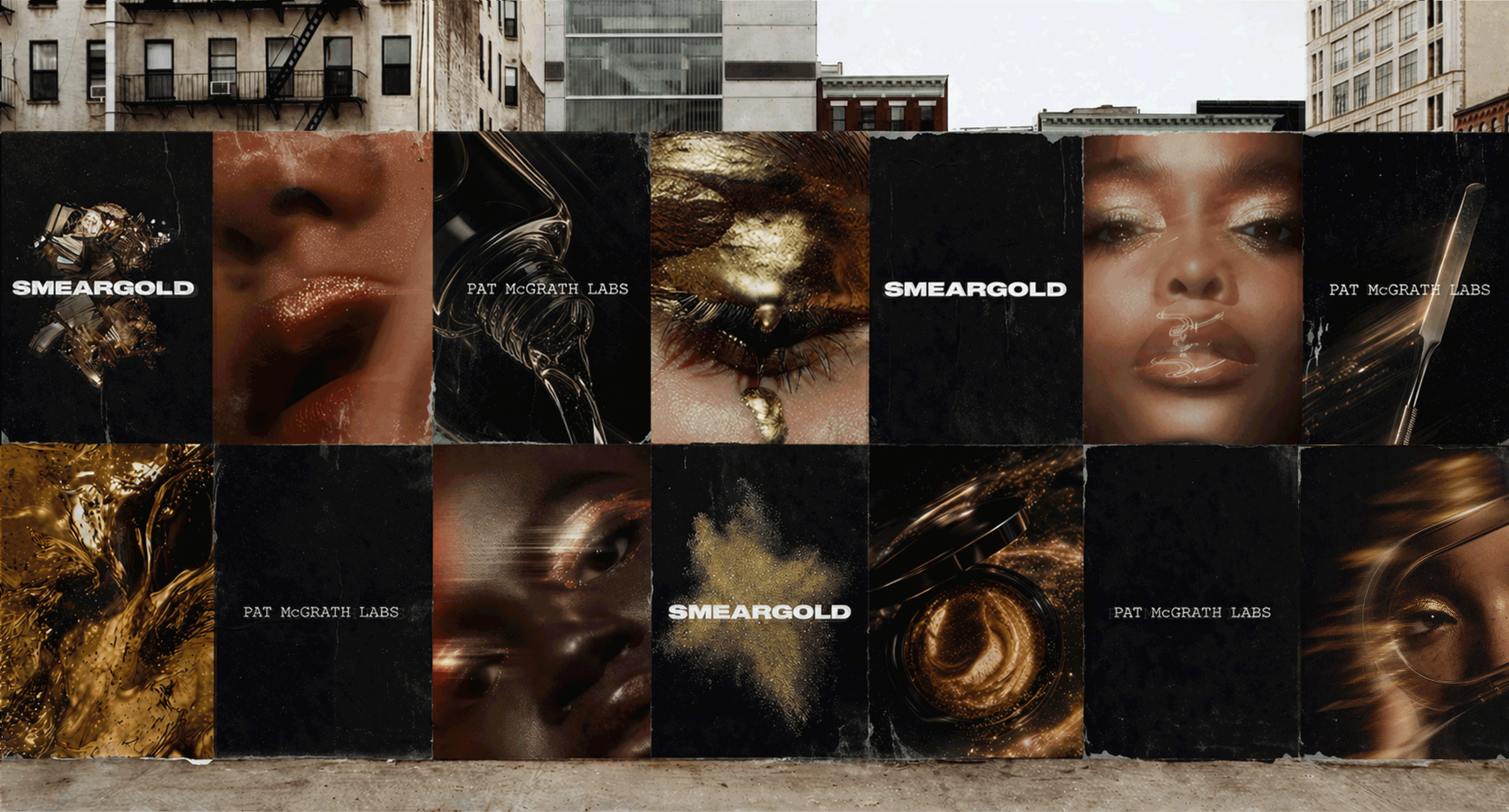The art direction uses gold as a symbol of transformation: fluid, messy, and powerful. By pairing abstract smears with polished editorial layouts, the campaign conveys both chaos and control, echoing Pat McGrath’s signature artistry. Meanwhile, the typography underscores the “lab” feel, framing Gold_001 as a rare, short-run creation.