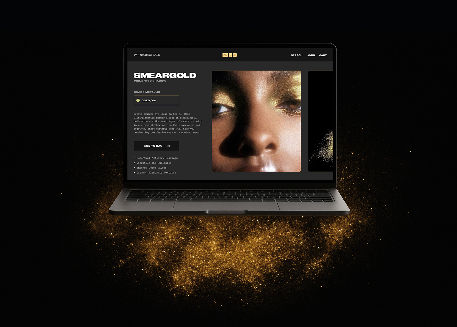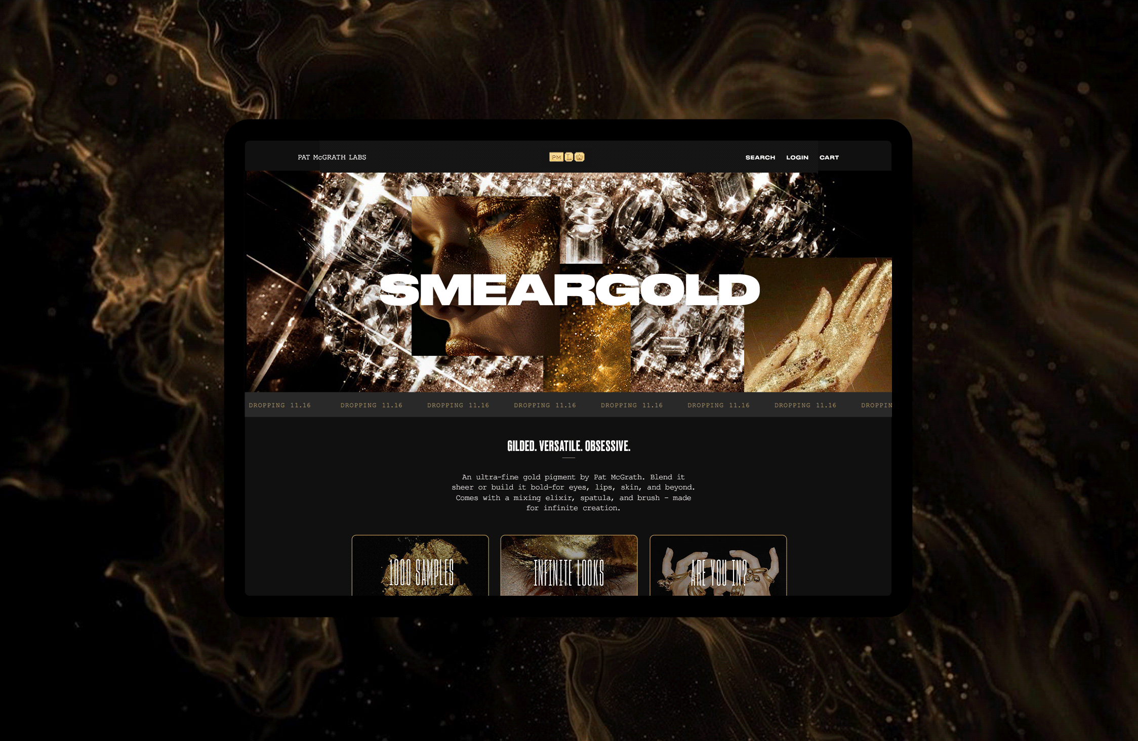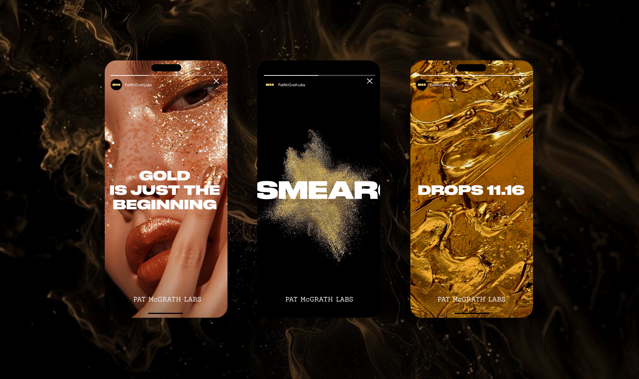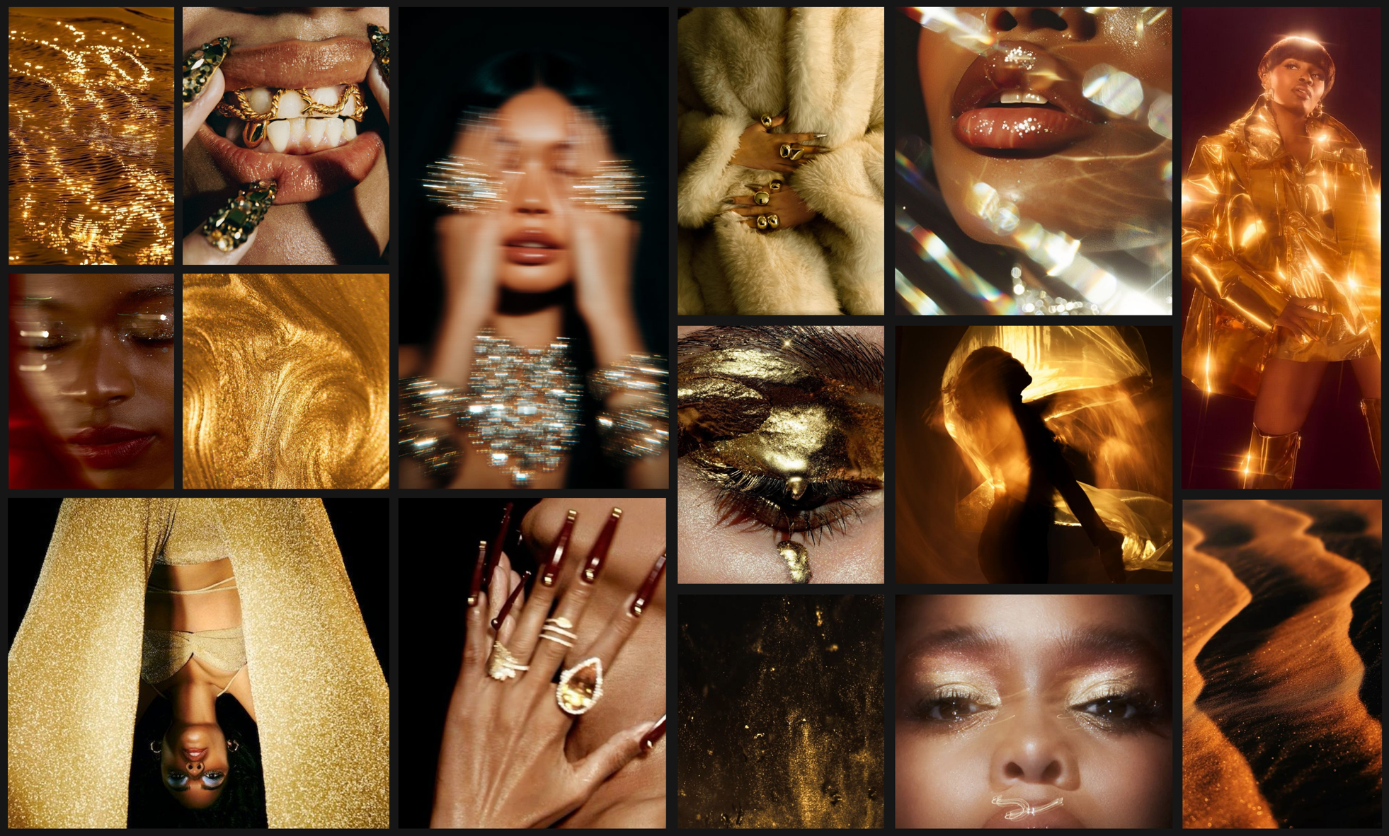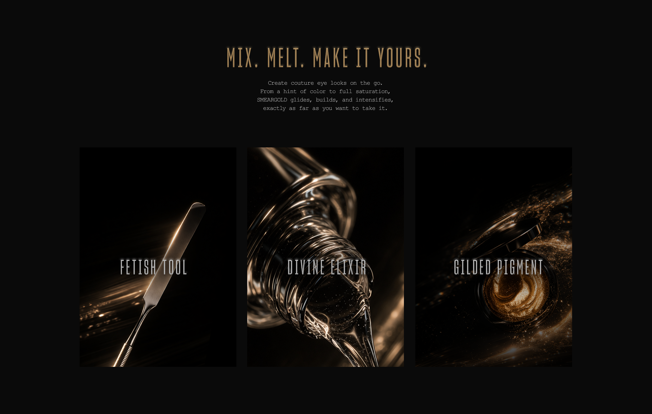 The art direction uses gold as a symbol of transformation: fluid, messy, and powerful. By pairing abstract smears with polished editorial layouts, the campaign conveys both chaos and control, echoing Pat McGrath’s signature artistry. Meanwhile, the typography underscores the “lab” feel, framing Gold_001 as a rare, short-run creation.